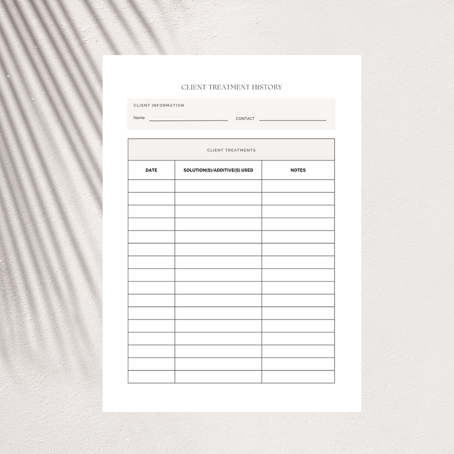 Keep track of your clients' treatments and preferences effortlessly with our customizable Client Treatment History form. Never again will you forget which solutions or additives were used during your clients' last appointments. This comprehensive form allows you to document every detail of each treatment, ensuring a personalized and consistent experience for every client.